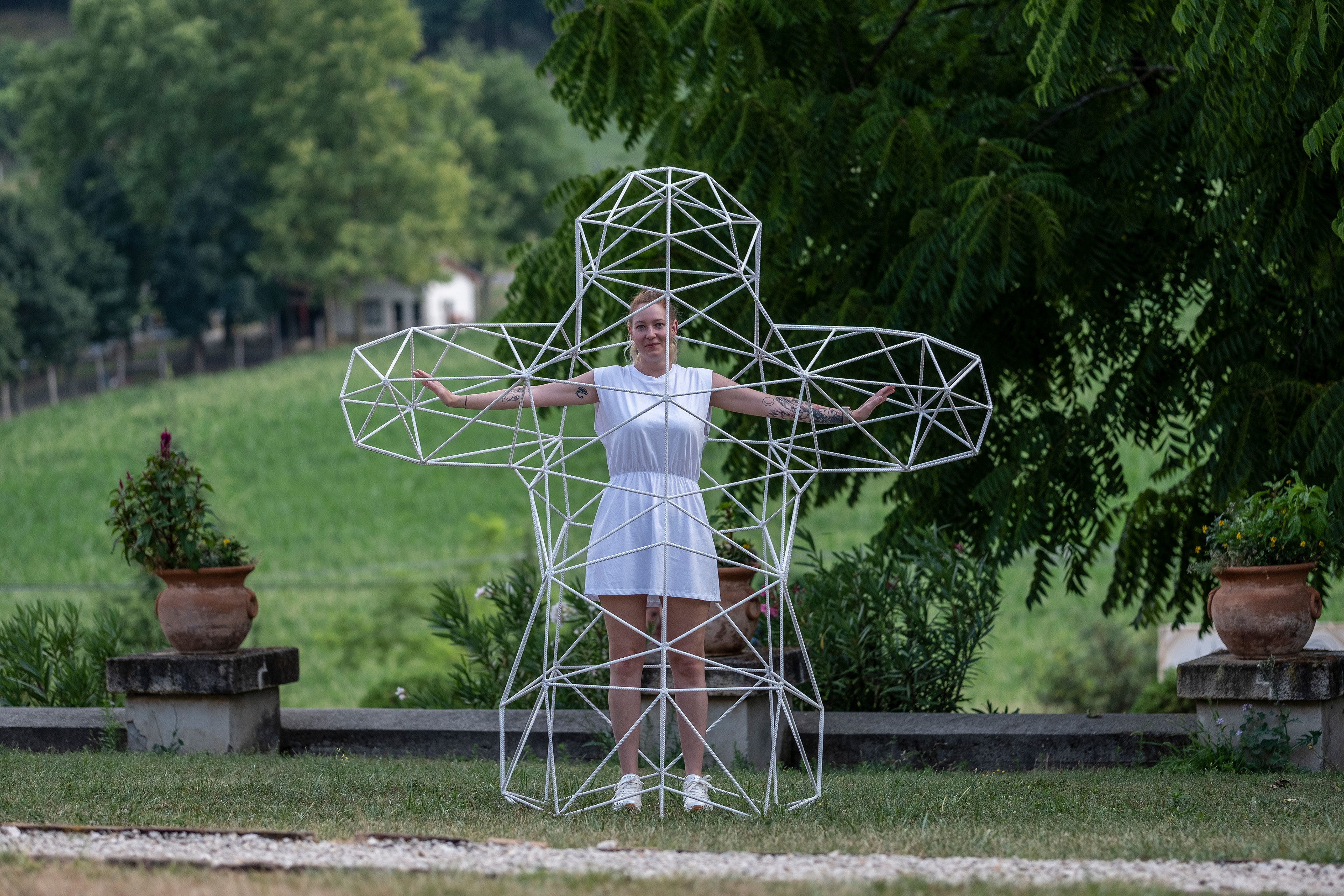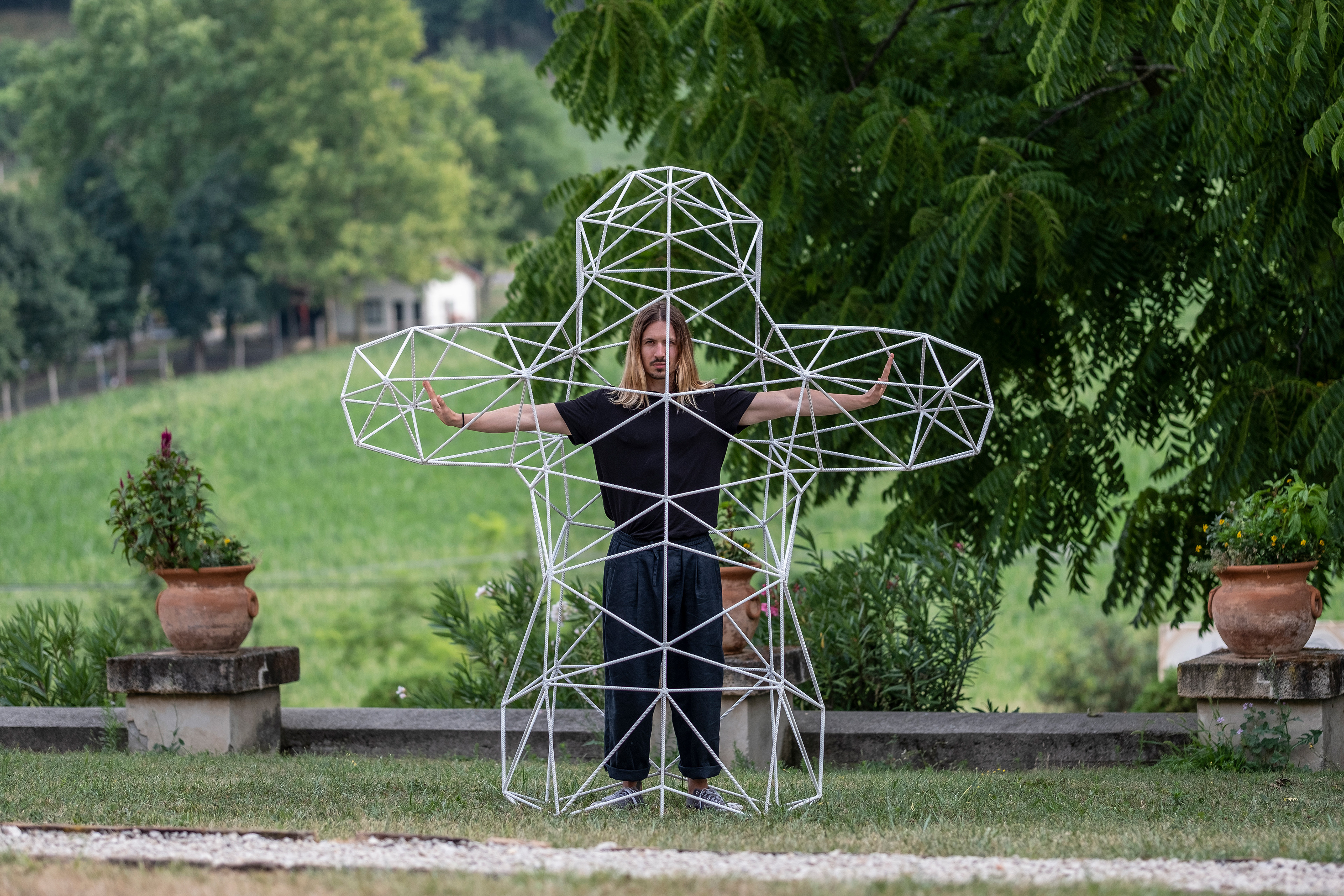 Tool for Privacy Practices (1.0) – Vitruvian Position is a body-scale, spatial aid that transforms the demarcation of private sphere from a theoretical concept into a tangible physical experience. Its central element is a mesh-like, geometric frame that outlines the imaginary extended boundaries of the human body. Evoking the iconic pose of the Vitruvian Man, the structure functions simultaneously as a protective net and a cage: it defines, isolates, and restricts.
